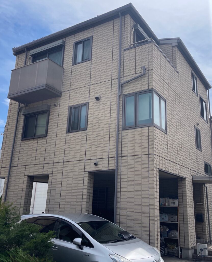 K様のお家は積水ハウスさん、築22年の初めての外壁屋根塗装工事となります。外壁ですが経年劣化に伴う色褪せが目立ちました。窯業系サイディングボードの外壁ですので洗浄(下地調整)後、下塗りを施し主材塗料にて中塗り・上塗りを行います。特にバルコニー壁や西面の壁は日当たりが良く、膨張収縮が起こり続けております。外壁の目地や開口部には、コーキングが設置されています。経年劣化により縦目地及び横目地と全体にひび割れが見受けられます。