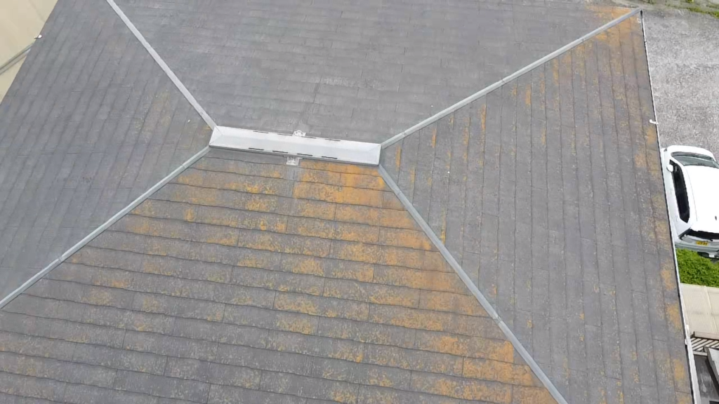屋根ですが、ニューコロニアルが施されており、表層塗膜は完全に劣化していると思います。反りかえりやクラックが起こる前に塗装が必要です。(反り返りが起こると強風により割れてりまったり、冬場に基材自体に水分を含みやすくなり凍結するとヒビ割れが起きます)。縁切り作業(タスペーサー設置)し、3回塗り致します。